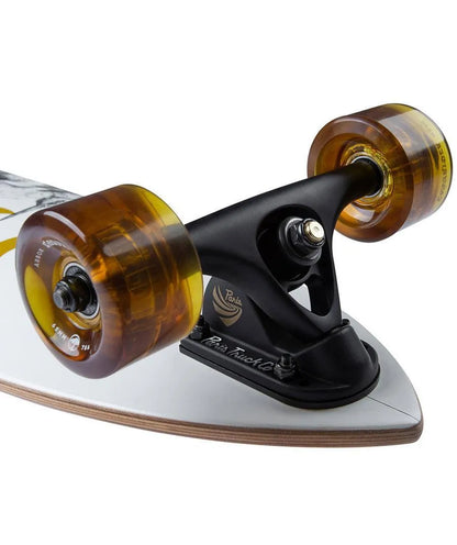 A compact pintail longboard skateboard with an extended wheelbase and mellow flex for around town cruising and lower speed carving.