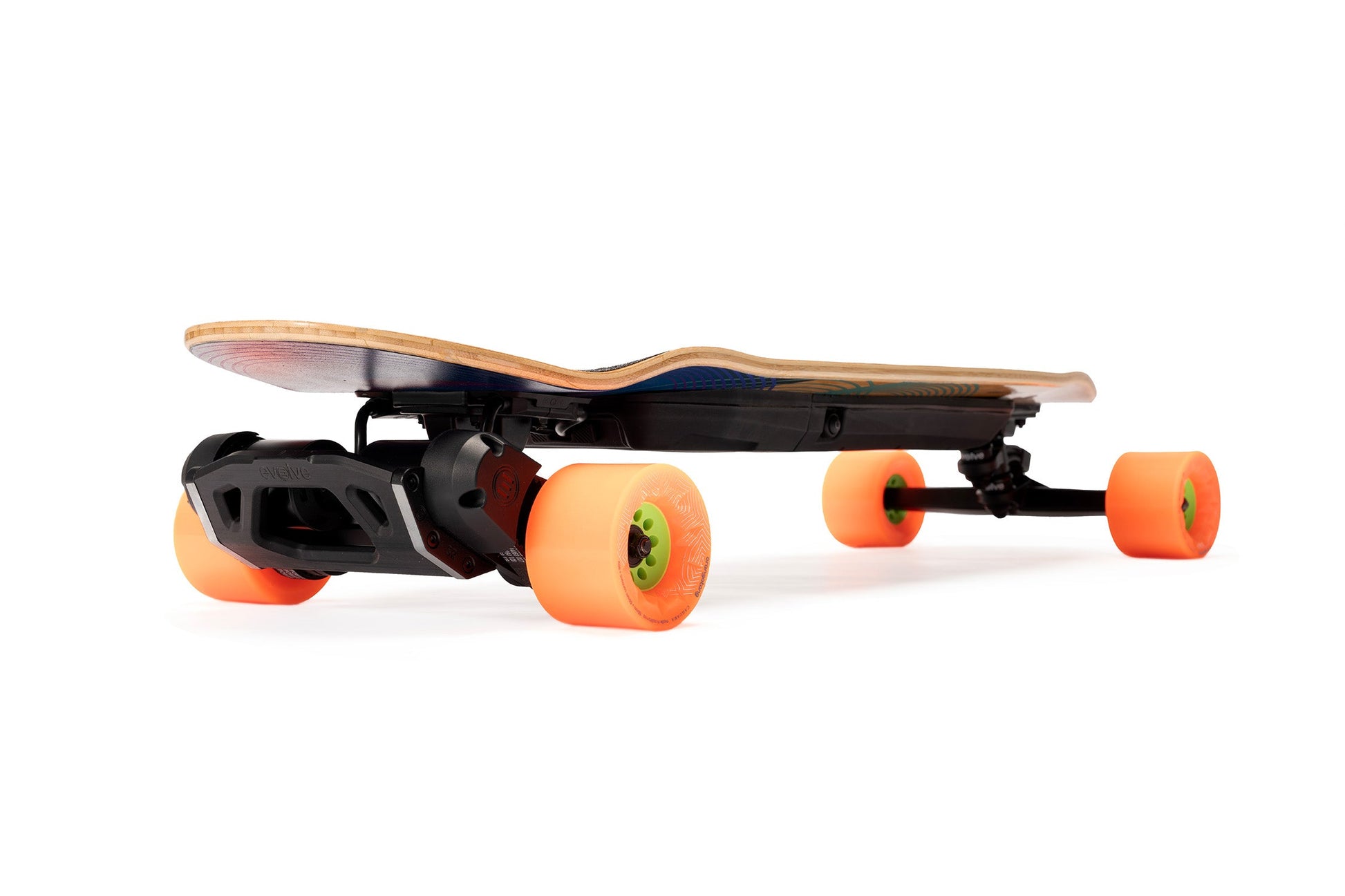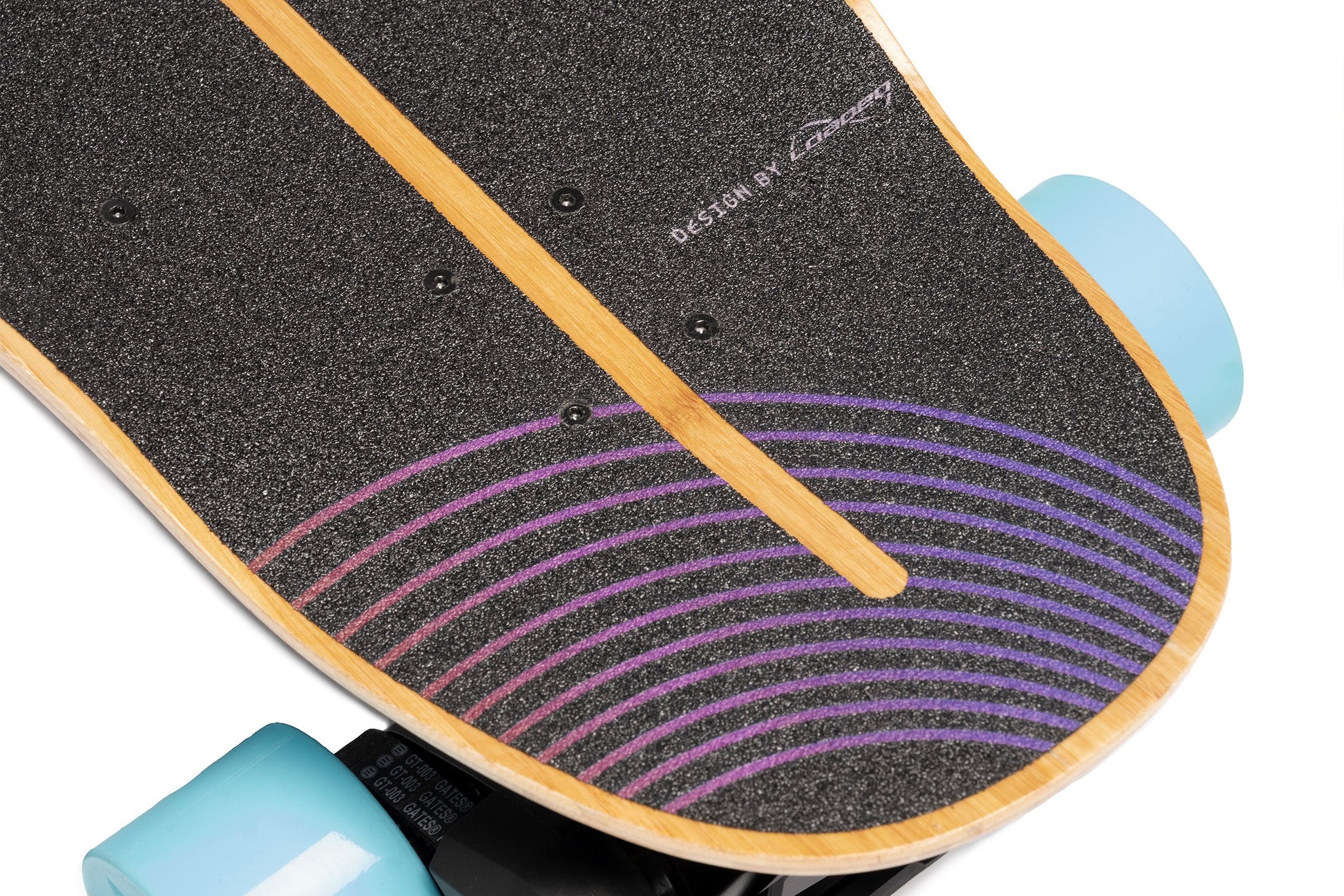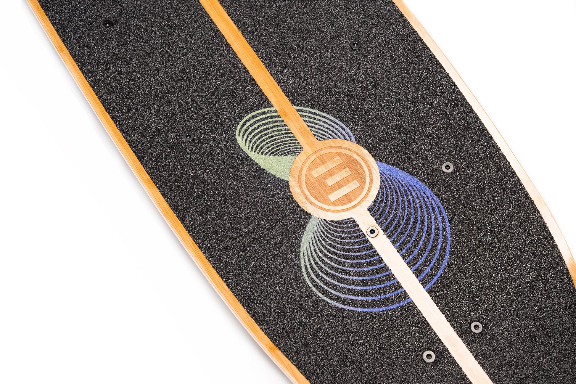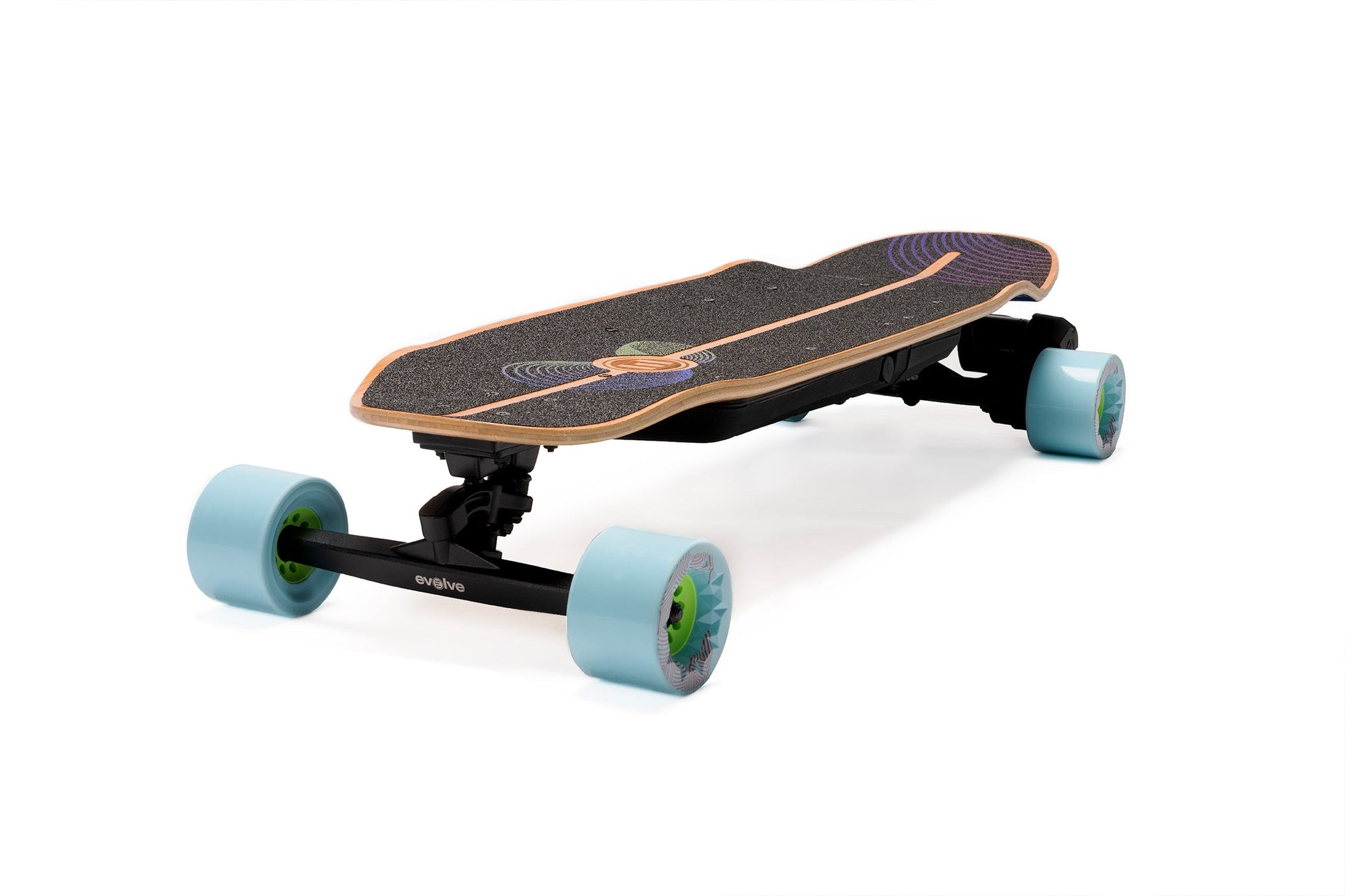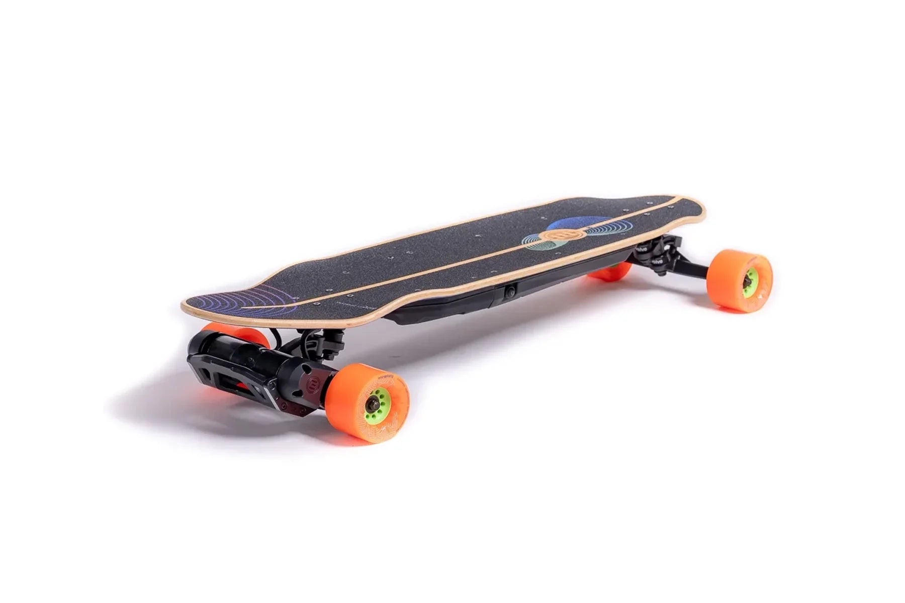 Inspired by the elliptical experiments of progressive surfboard shapers like Tomo and Album, the Onirique's performance-driven outline was created to camouflage highly complex curvatures in a seemingly simple and appealing shape. The graphic design by Nanastudio is meant to evoke the dreamlike quality of the deck name and the riding experience. As a finishing touch, the Evolve logo is laser-etched into the bamboo top sheet, showcasing the partnership between Loaded Boards and Evolve in creating this extraordinary e-skate deck.