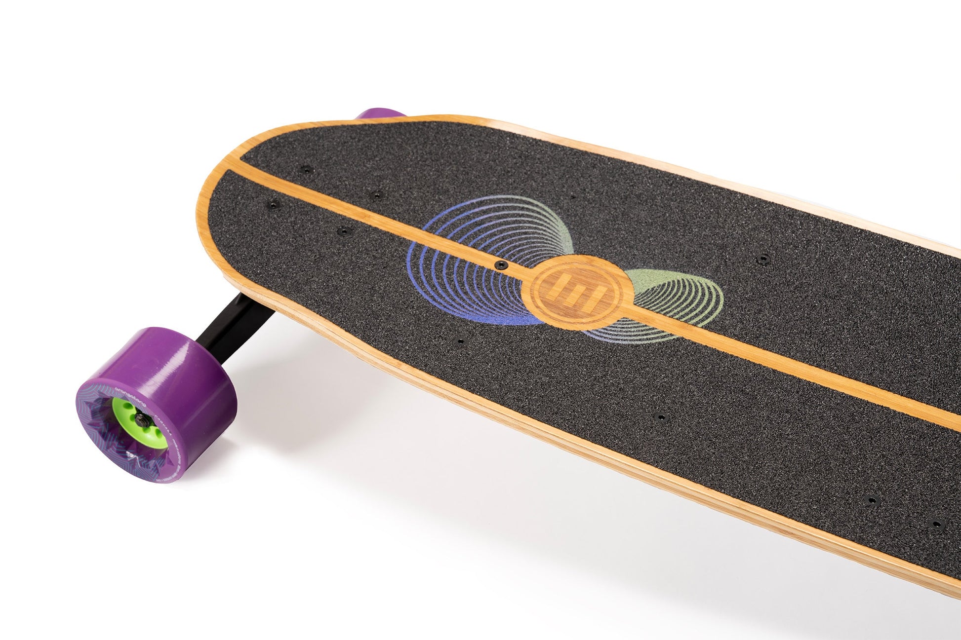 Crafted with precision, the Onirique features a three-layer bamboo core sandwiched between fibreglass/epoxy layers to provide a lightweight yet robust structure. The top and bottom of the deck showcase bamboo veneers, not only adding to its aesthetic appeal but also enhancing its functionality. Aggressive grip tape is used for increased board hold for both cruising and next-gen e-skate ripping.